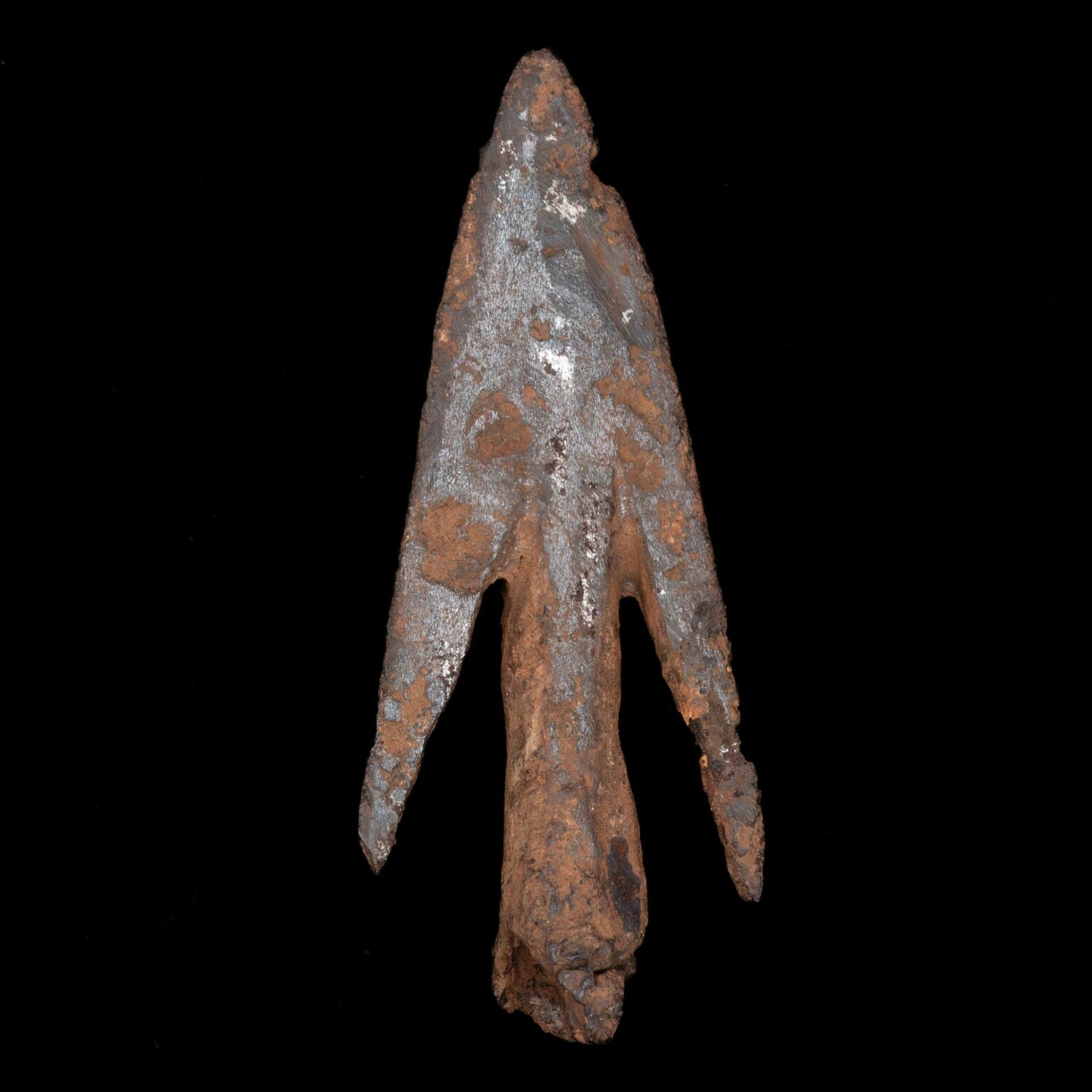 A nicely preserved Medieval longbow arrow-head, 8th-10th century AD. Made of iron with 2-barbed swallowtail head and flared socketed base, where it was have been attached to the arrow’s shaft. L: 2”, W: 0.75”. Ex Los Angeles, CA weapons collection.Accompanied by a hand-signed certificate of authenticity which includes all the details, culture, dating, motifs/inscriptions when applicable, historical relevance, and provenance. --Weight:0.4 oz