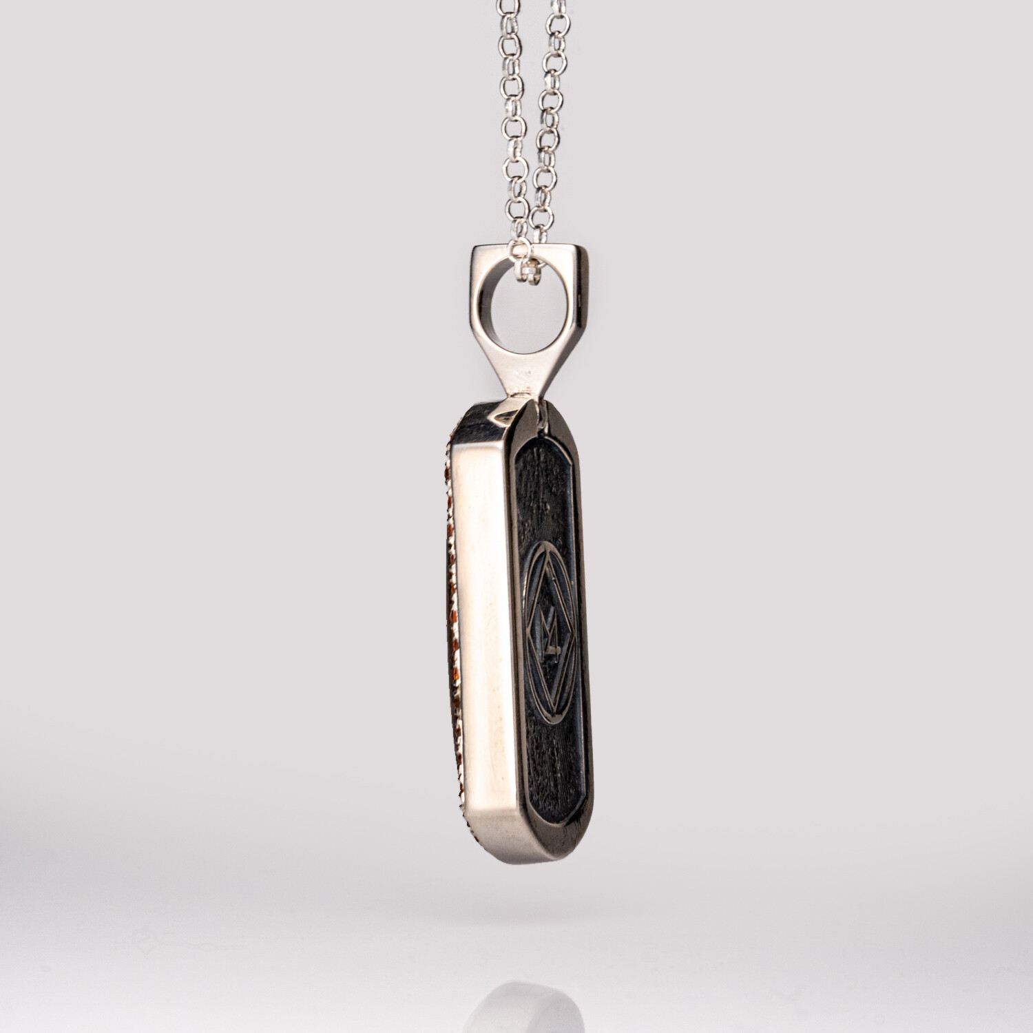 This exquisite, hand-made Dinosaur Agate Pendant is set in solid sterling silver with a genuine yellow sapphire bezel. The dinosaur agate is around 60 million years old. The stunning colors in the bone are the result of minerals that have been absorbed into the bone over periods of thousands of years that it was buried.
