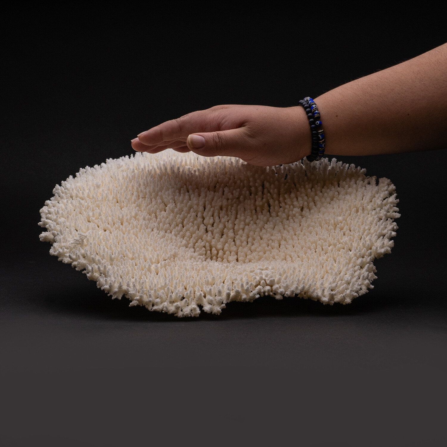 This large, genuine Table Coral gets its name from its shape. It has a broad horizontal surface. This is truly a one of a kind piece, and would make a beautiful display piece. You will receive the exact object in this photo.