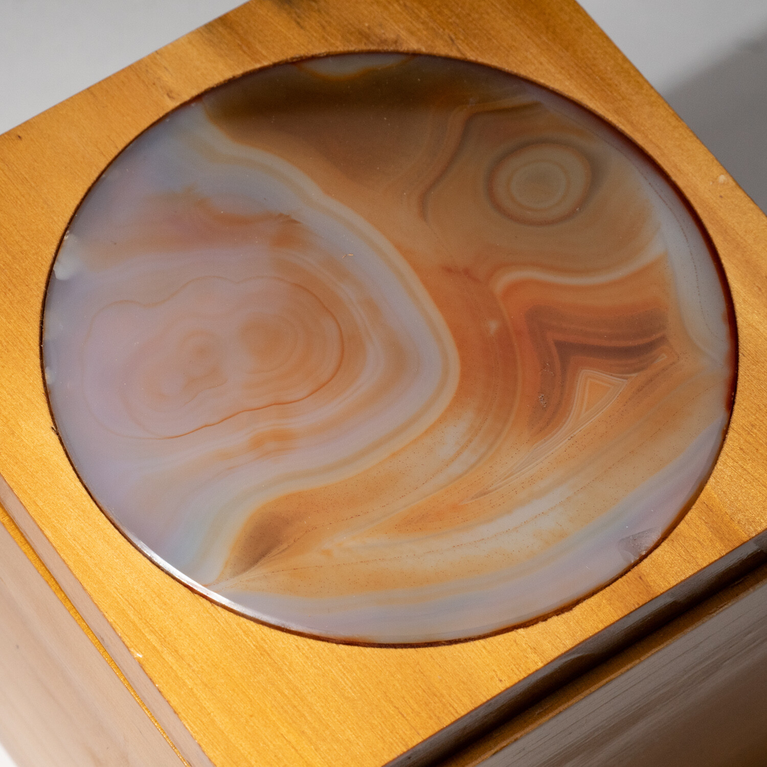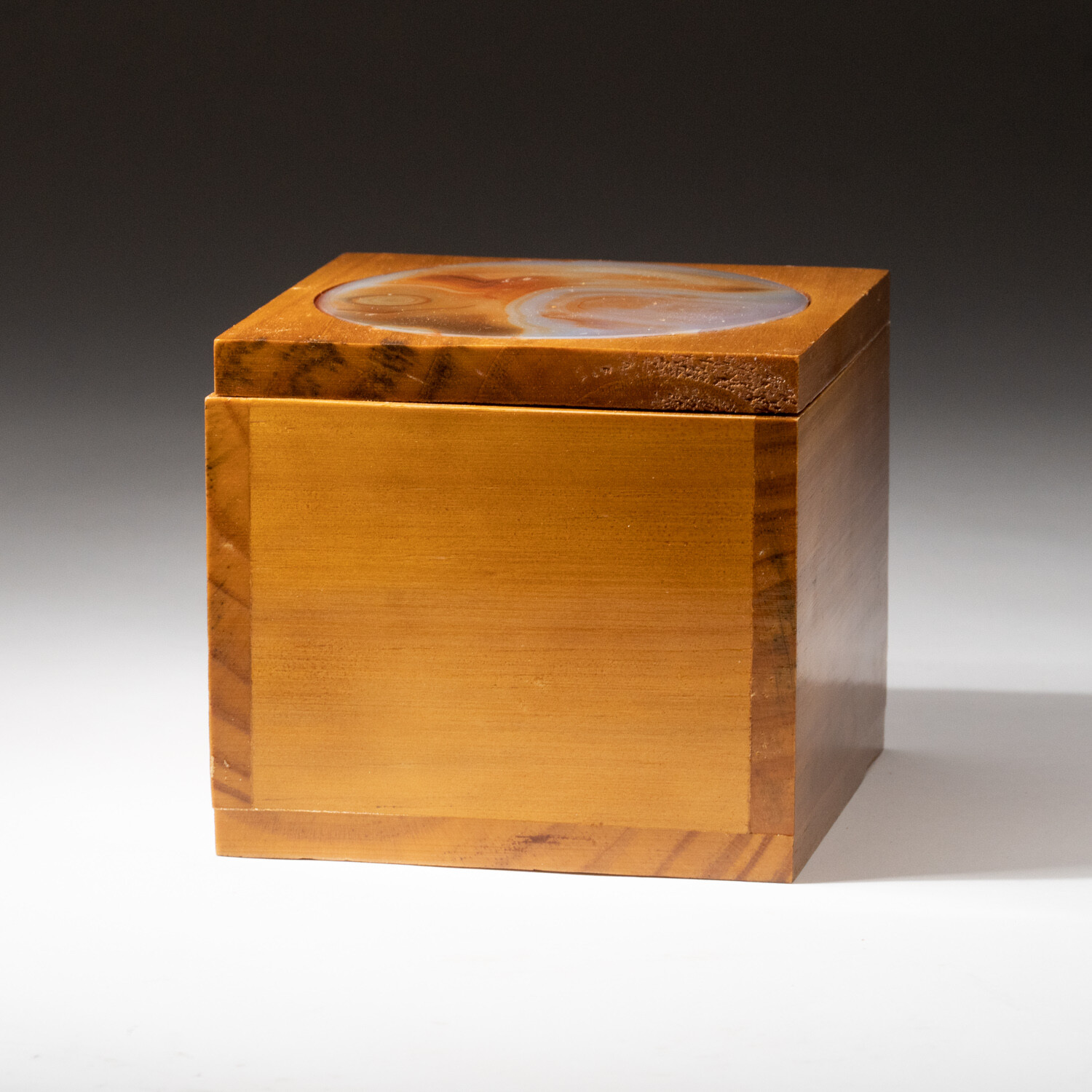 A beautiful wooden mahogany box with an agate inlay lid. This agate inlay has a vibrant red and yellow colors with a soft, organic pattern. This would be the perfect gift to compliment any living space.