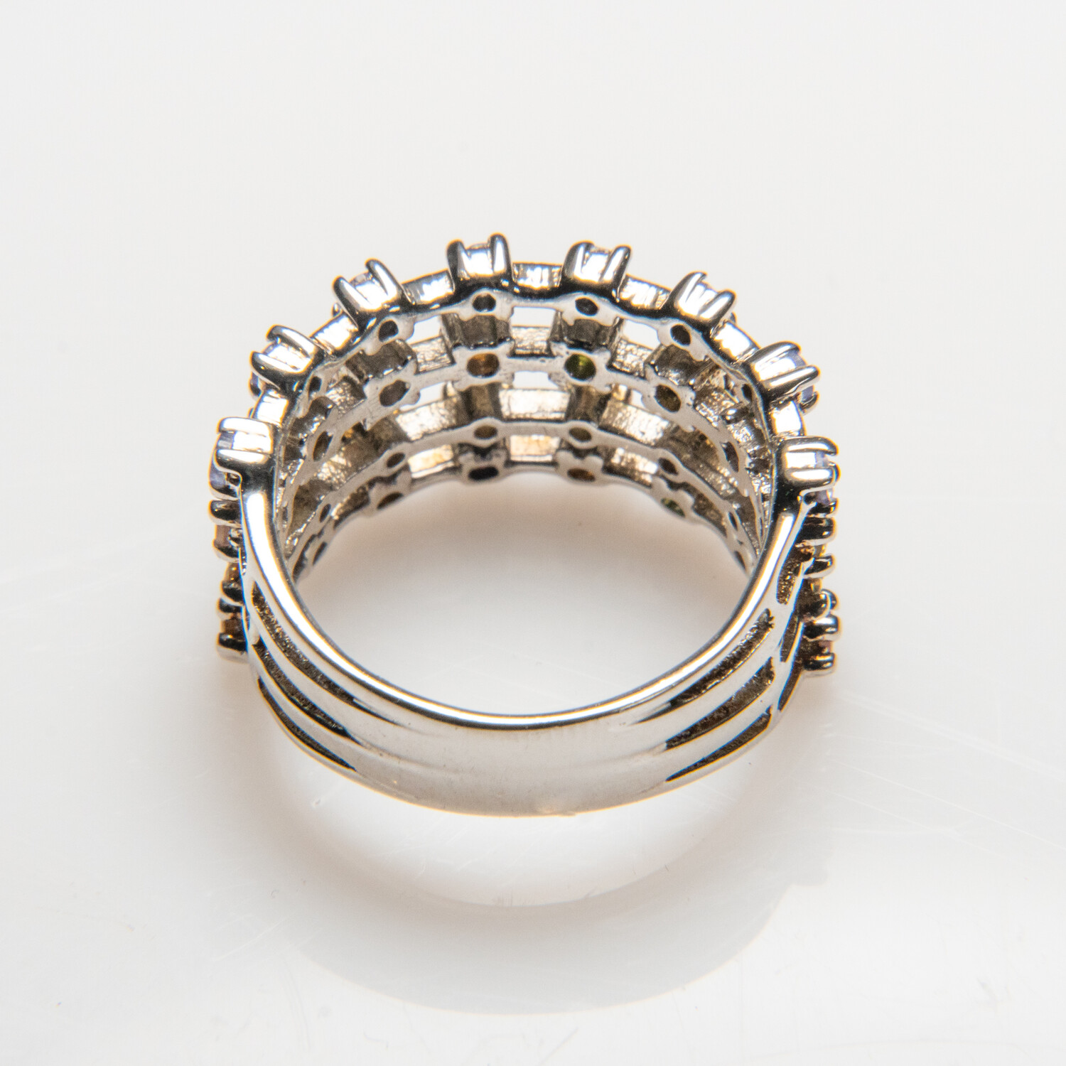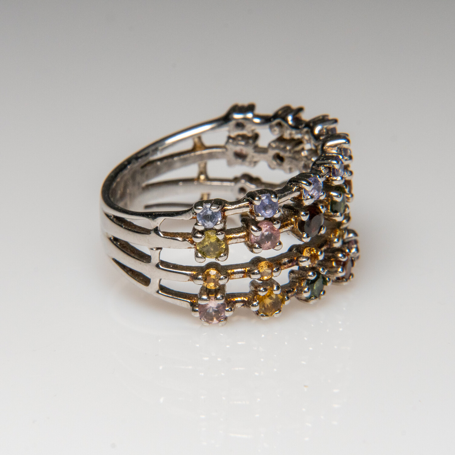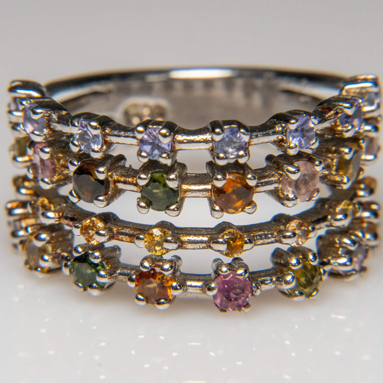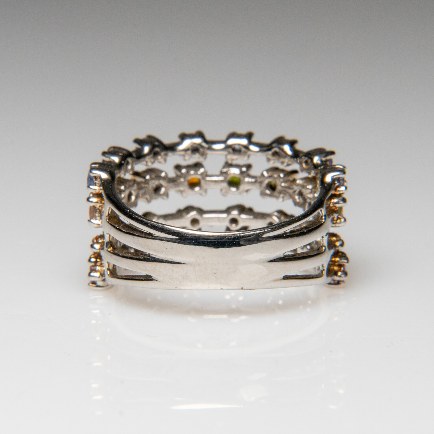 Beautiful, sterling silver 10mm stacking ring featuring rows of bezel-set tourmaline gemstones, offering a playful blend of sparkle and color in a modern layered design.--Weight:10mm