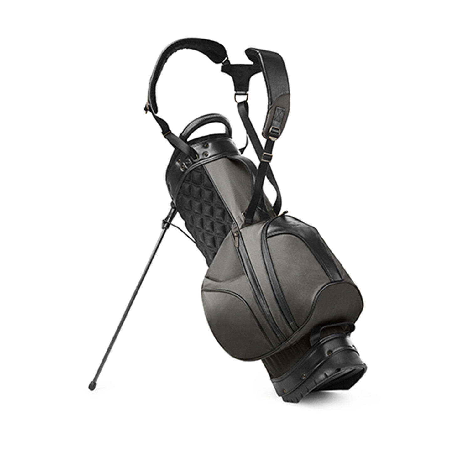 The Bentley Golf Stand Bag is hand crafted in a combination of water resistant technical fabric, leather and light weight carbon legs ensuring the Golf Stand Bag is highly portable. The bag features rubber zip linings for extra water resistance, a cool pocket to keep drinks cold and a luxurious diamond quilted front pocket coupled with a faux fur lined valuables pocket. The Bentley Golf Stand Bag features a 14 way divider as well as a rain hood that can be attached to the top of the bag.