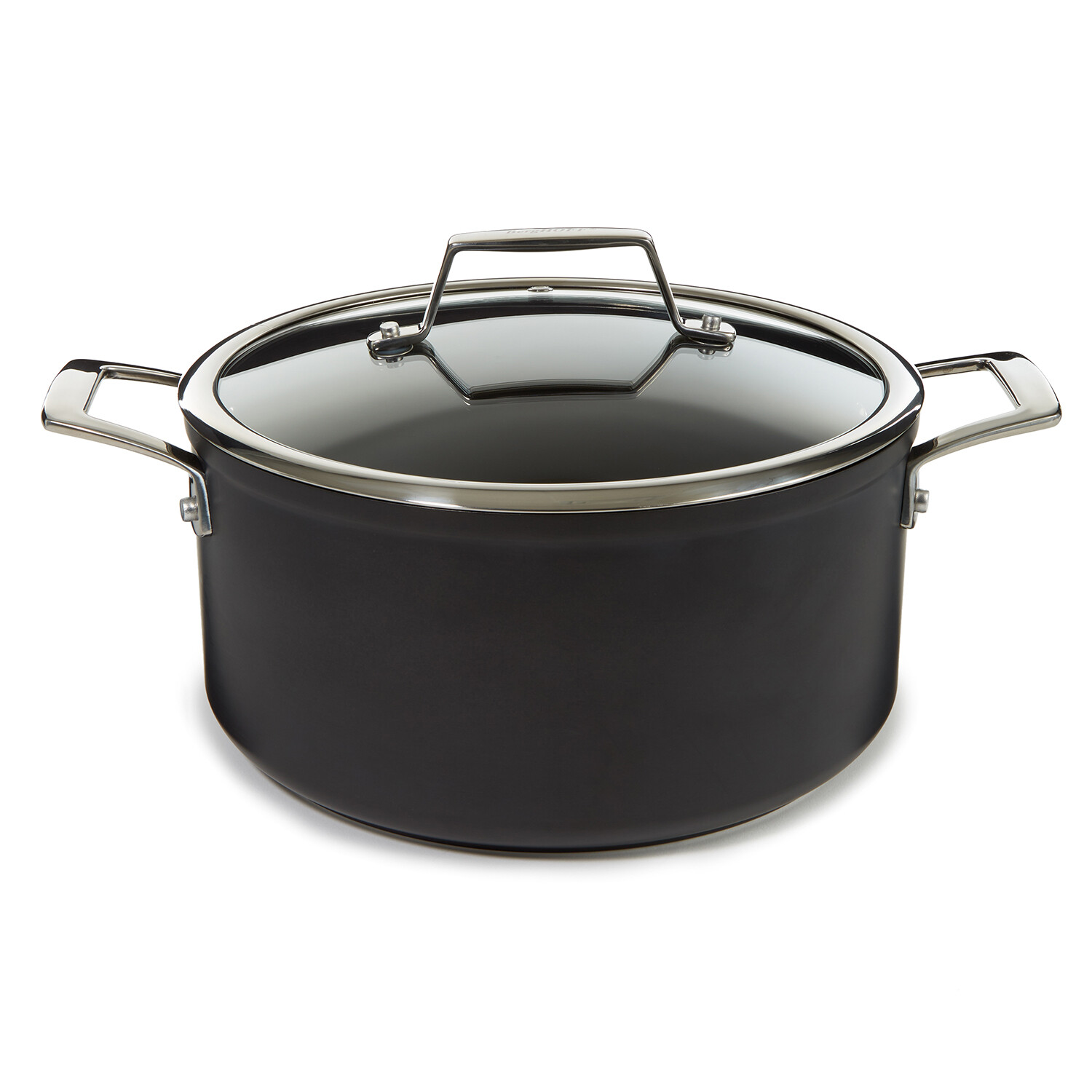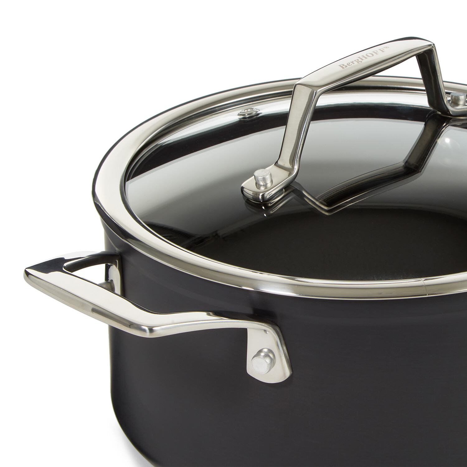 Hard Anodized Aluminum Body, Stainless Steel Handles, Glass Lid