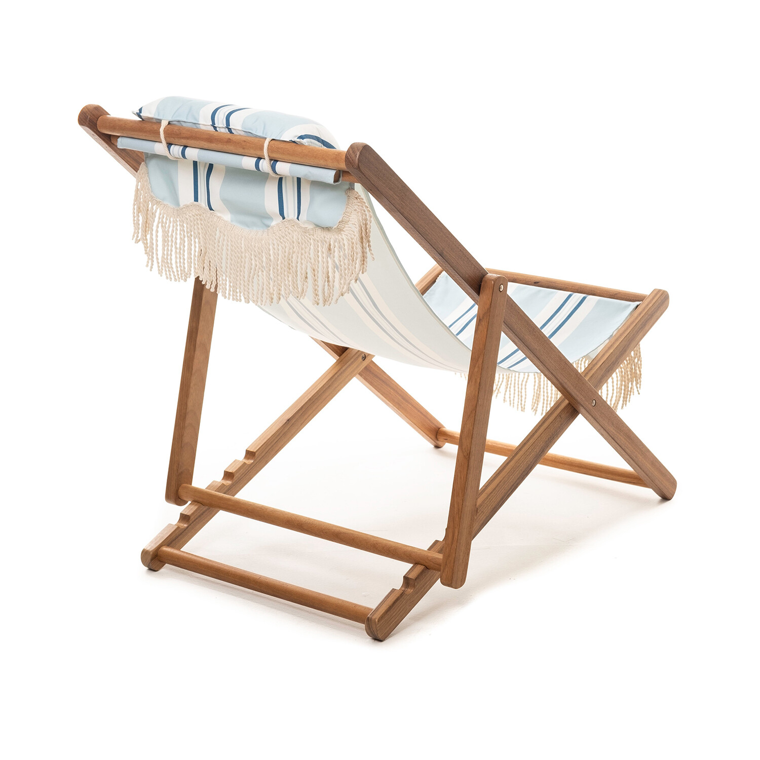 Ideal for the beach, lake, or deck, this timeless sling chair receives a stylish makeover with beautiful fringe and a scalloped valance. Constructed using a teak frame and coated canvas sling, which offers the convenience of being UV- and water-resistant, it brings both comfort and elegance to any porch or beach arrangement. Additionally, it can be easily folded up to save space when not in use