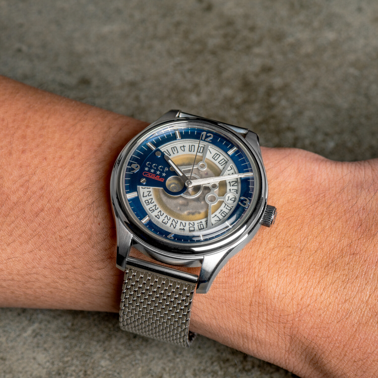 COLLECTION: SPUTNIK-2 MODEL: CP-7026-11 MOVEMENT: (SLAVA#2427) MECHANICAL AUTOMATIC CASE MATERIAL: STAINLESS STEEL CASE DIAMETER (MM): 43 CASE THICKNESS (MM): 15.5 CASE SHAPE: ROUND CASE COLOR: STAINLESS STEEL DIAL COLOR: BLUE BAND: MESH BAND BAND COLOR: STAINLESS STEEL BUCKLE: STRAP BUCKLE BAND WIDTH (MM): 20 WATER RESISTANCE: 5 ATM WATCH WEIGHT (G): 150 WARRANTY: 2 YEARS