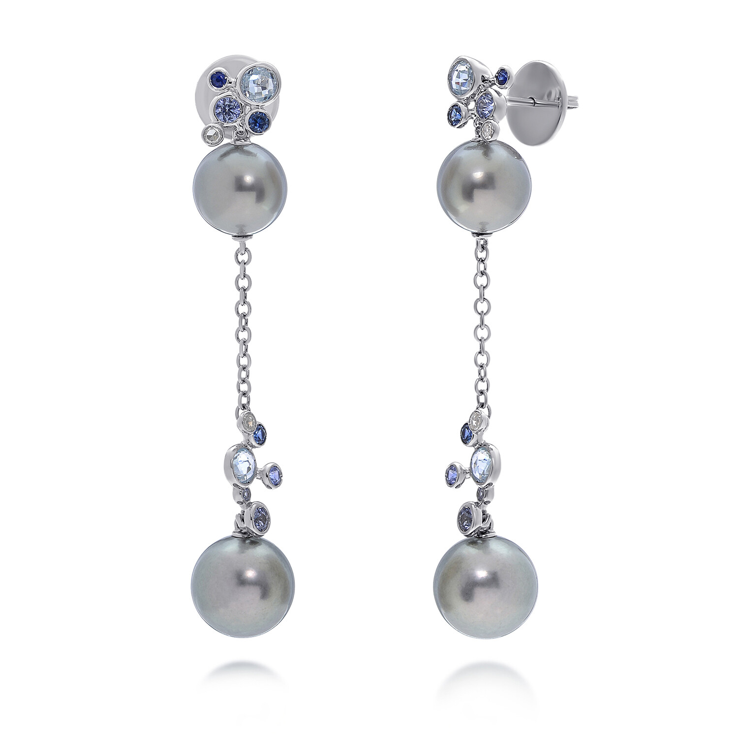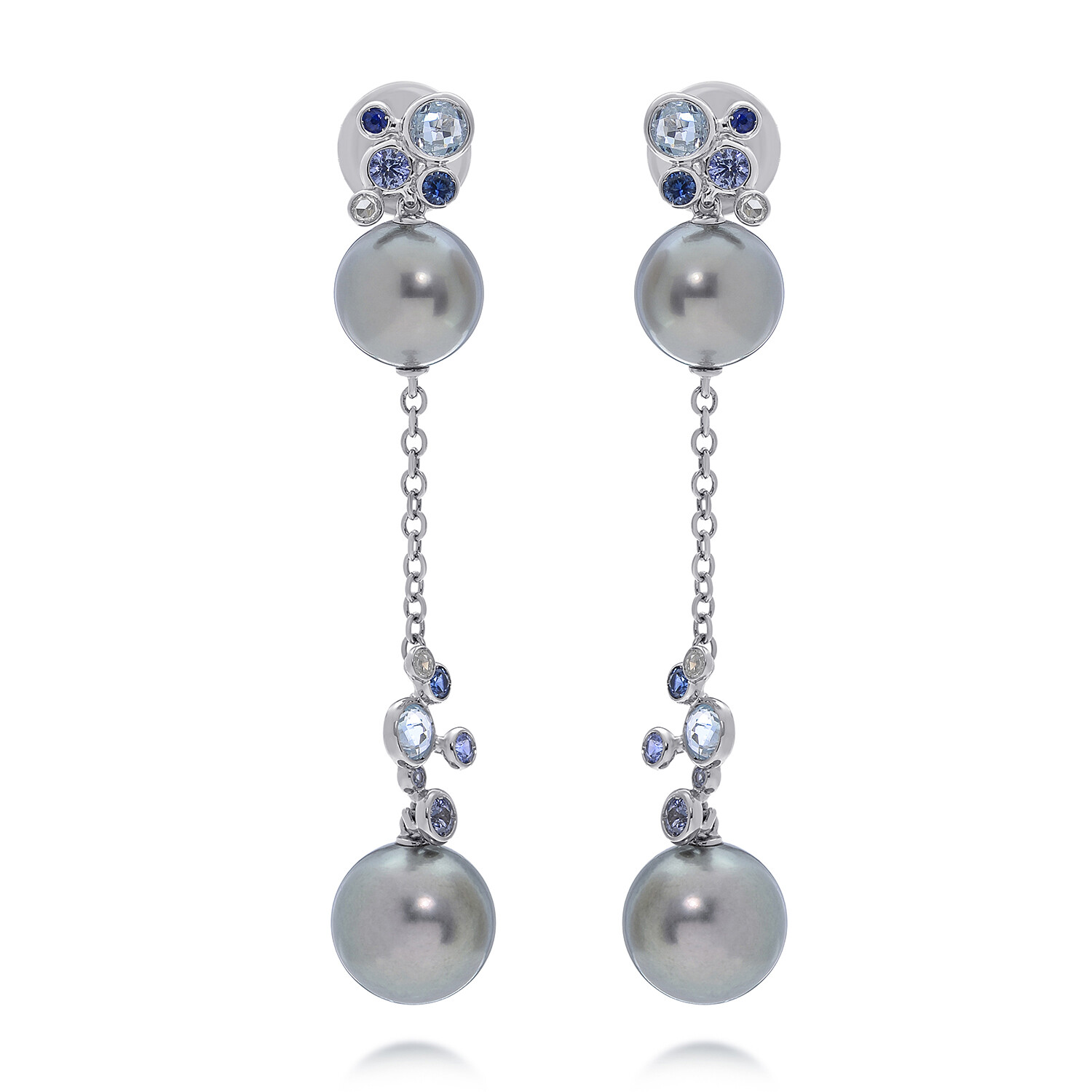 Damiani 18K White Gold Tahitian Pearl + Blue Sapphire Diamond Drop Earrings // Store Display