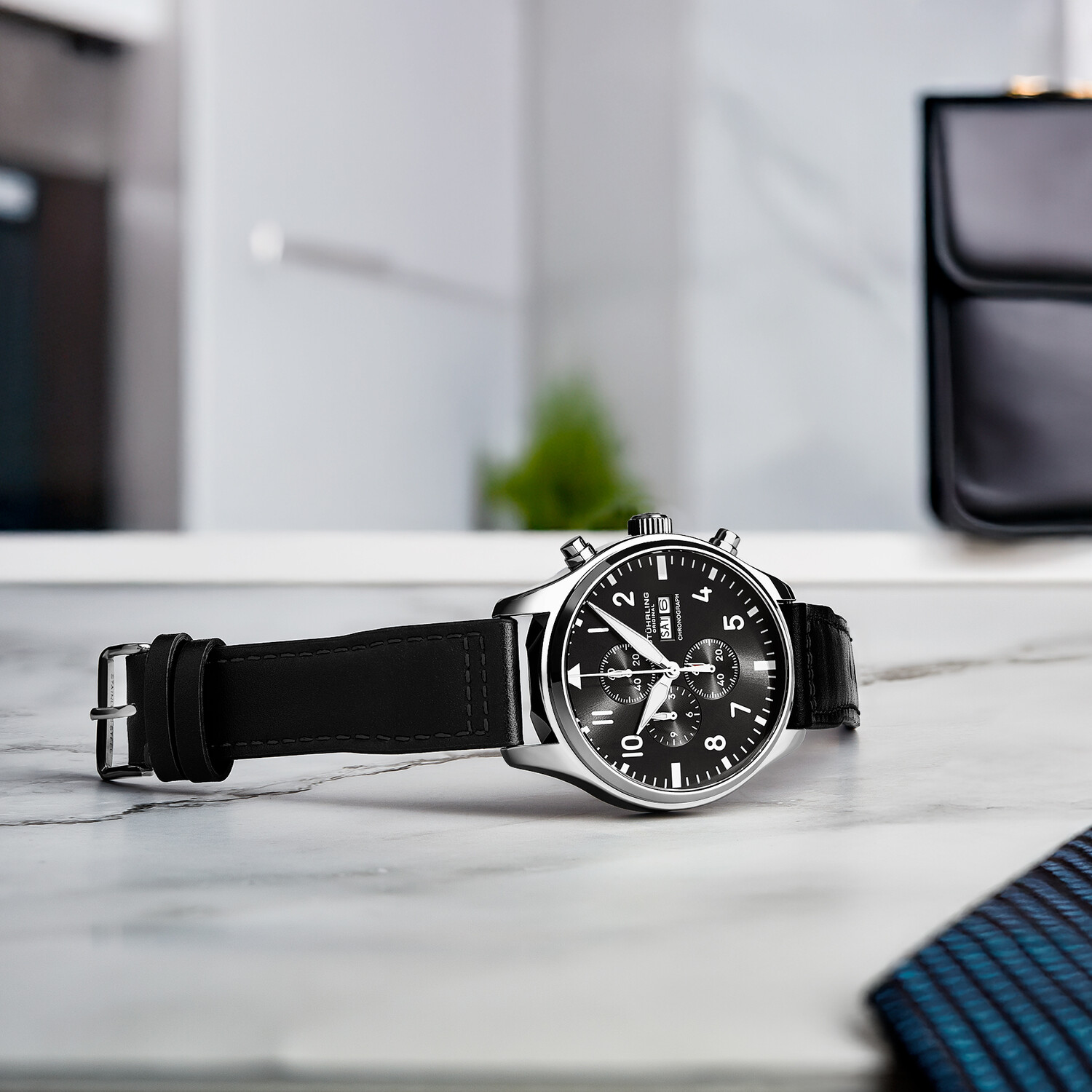 Alloy case, jet black sunray dial, black leather strap, mineral crystal, 50M WR, Miyota chronograph movement, calendar subdials