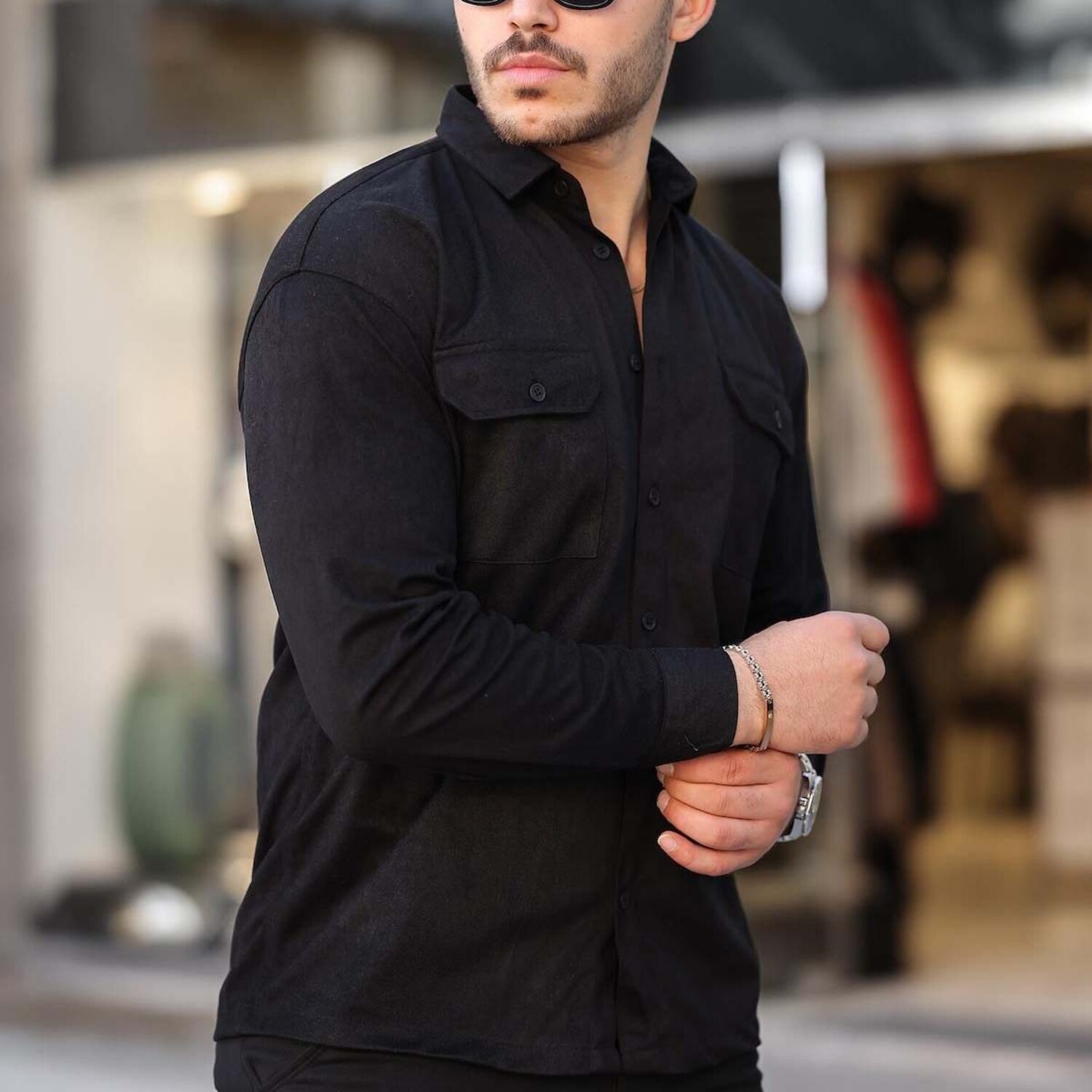Corduroy Type Chest Pockets Button-Up Shirt // Black