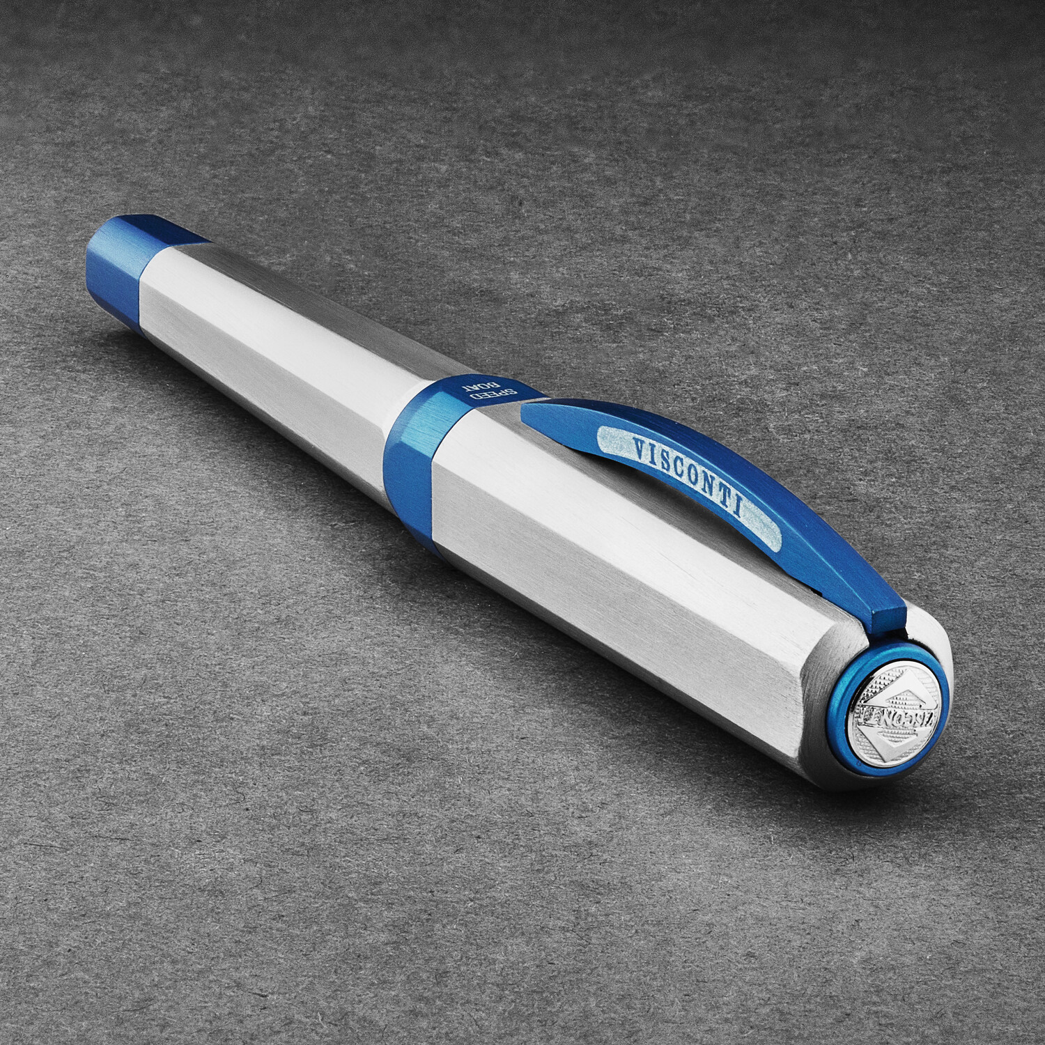 The Visconti Opera Metal rollerball pen has been crafted from anodized avional aluminum. Each pen comes with the Visconti "hood-safe" lock system on the squaring the circle design. The cap and barrel have a square shape with rounded corners so the pen stays put when you set it down. The cap then has the arch shape Visconti spring loaded clip.
